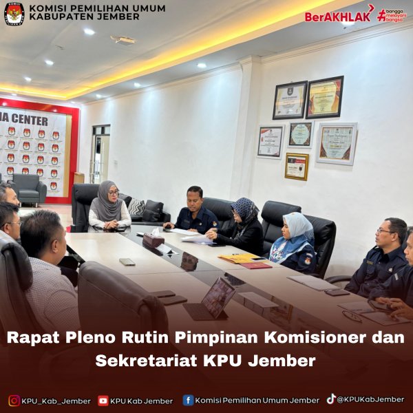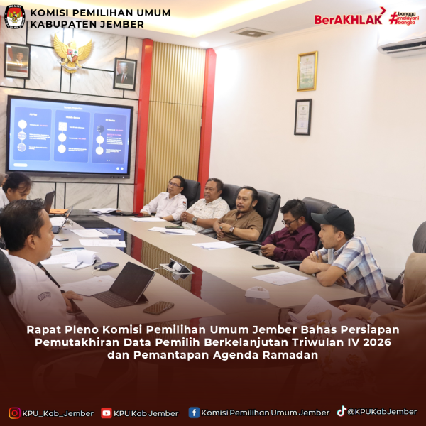 Jember, kab-jember.kpu.go.id – Pada hari Selasa, 24 Februari 2026, Komisi Pemilihan Umum Kabupaten Jember telah menyelenggarakan agenda Rapat Pleno Rutin Tahun 2026. Kegiatan koordinasi internal yang dimulai secara tepat waktu pada pukul 10.00 WIB ini bertempat di fasilitas Ruang Media Center Kantor KPU Kabupaten Jember. Agenda tersebut merupakan tindak lanjut dari surat undangan resmi dengan nomor register 021/TU.01.1-UND/3509/2026 yang memiliki sifat penting dan dikeluarkan pada 23 Februari 2026. Forum diskusi strategis tersebut dipimpin langsung oleh Ibu Dessi Anggraeni. Sebagaimana sasaran yang tercantum dalam surat undangan, rapat ini mengumpulkan para pimpinan lembaga, yang terdiri atas para Anggota KPU Kab Jember, Sekretaris KPU Kab Jember, serta jajaran Kasubbag KPU Kab Jember. Bapak Agus Zainur Rahmat yang menjabat sebagai Sekretaris turut hadir guna menyelaraskan visi antara pimpinan komisioner dan staf kesekretariatan. Sinergi ini dinilai esensial untuk menjaga ritme kinerja institusi, sehingga seluruh tahapan layanan kepemiluan dapat terselenggara dengan berkualitas. Pembahasan dalam pleno kali ini mengerucut pada tiga isu fundamental. Pertama, pemutakhiran Daftar Informasi Publik (DIP) guna menjamin kemudahan akses informasi bagi publik. Kedua, evaluasi komprehensif terkait pelaksanaan dan serapan anggaran operasional. Terkait poin ini, pimpinan KPU menginstruksikan setiap divisi untuk lebih cermat memantau teknis pendanaan agar asas akuntabilitas terus terjaga tanpa kendala. Ketiga, peningkatan standar etika komunikasi publik. Seluruh jajaran staf diwajibkan menjunjung tinggi profesionalisme serta mematuhi kode etik saat merespons aduan masyarakat, demi membentengi masyarakat dari paparan disinformasi yang rentan terjadi. Sebagai konklusi dari pertemuan ini, jajaran pimpinan dan staf merumuskan peta jalan serta rencana aksi untuk bulan berikutnya. Salah satu gagasan utamanya adalah penguatan infrastruktur digital institusi. Melalui fondasi kerja sama yang solid ini, KPU Jember sangat optimis mampu mempertahankan integritas lembaganya serta terus menghadirkan layanan publik yang prima di sepanjang tahun. (dwp) ....