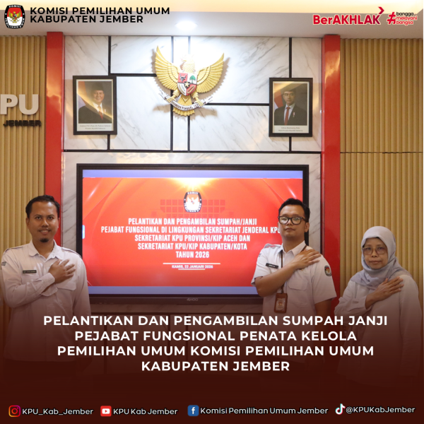 Jember, kab-jember.kpu.go.id - Dalam upaya memantapkan profesionalisme dan reformasi birokrasi di lingkungan penyelenggara pemilu, Sekretariat Komisi Pemilihan Umum (KPU) Kabupaten Jember berpartisipasi dalam agenda nasional pelantikan pejabat fungsional. Kegiatan "Pelantikan dan Pengambilan Sumpah/Janji Pejabat Fungsional Penata Kelola Pemilihan Umum" ini diselenggarakan terpusat oleh KPU Republik Indonesia pada Kamis, 22 Januari 2026. Meskipun seremoni utama berpusat di Jakarta, prosesi pengukuhan ini dilaksanakan secara hibrida (daring). KPU Kabupaten Jember mengikuti jalannya acara dengan penuh khidmat dari kantor satuan kerja setempat mulai pukul 14.00 WIB. Agenda ini merupakan realisasi dari undangan resmi Sekretariat Jenderal KPU RI yang bertujuan untuk memperkokoh struktur kelembagaan mulai dari pusat hingga ke daerah. Dalam momen sakral tersebut, Andik Kurniawan Hardiansyah, salah satu staf Sekretariat KPU Kabupaten Jember, resmi diambil sumpahnya untuk mengemban amanah baru sebagai Pejabat Fungsional Penata Kelola Pemilihan Umum. Pelantikan Andik menjadi tonggak penting bagi KPU Jember dalam melengkapi formasi jabatan fungsional yang memiliki peran strategis dalam teknis tata kelola kepemiluan. Prosesi pengambilan sumpah di kantor KPU Jember disaksikan secara langsung oleh Sekretaris KPU Kabupaten Jember, Bapak Agus Zainur Rahmat, yang bertindak sebagai saksi utama. Turut hadir mendampingi dan memberikan dukungan moril dalam acara tersebut adalah jajaran pejabat struktural, yakni Ibu Siti Nur Indah selaku Kasubbag SDM, Parmas, dan Sosdiklih, serta Bapak Adi Setyawan selaku Kasubbag Teknis Penyelenggaraan Pemilu dan Hukum. Acara yang berlangsung dengan tertib ini menandai komitmen KPU dalam meningkatkan kualitas sumber daya manusianya. Dengan beralihnya status menjadi pejabat fungsional, diharapkan Andik Kurniawan Hardiansyah dapat bekerja lebih spesifik, mandiri, dan profesional. Manajemen KPU Kabupaten Jember menaruh harapan besar bahwa pelantikan ini akan membawa dampak positif langsung terhadap kinerja lembaga. Kehadiran pejabat fungsional yang kompeten diyakini akan menjadi energi baru dalam mengawal integritas demokrasi serta menyukseskan penyelenggaraan Pemilihan Umum maupun Pemilihan Serentak yang akan datang.