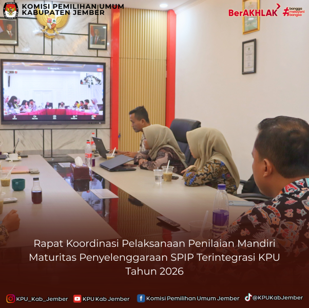 Jember, kab-jember.kpu.go.id - Komisi Pemilihan Umum (KPU) Kabupaten Jember berpartisipasi aktif dalam agenda nasional Rapat Koordinasi Pelaksanaan Penilaian Mandiri Maturitas Penyelenggaraan Sistem Pengendalian Intern Pemerintah (SPIP) Terintegrasi Tahun 2026. Kegiatan ini dilaksanakan pada hari Jumat, 30 Januari 2026, yang menghubungkan KPU RI dengan seluruh satuan kerja di tingkat provinsi hingga kabupaten/kota melalui sambungan Zoom Meeting. Partisipasi KPU Jember ini merupakan tindak lanjut dari surat undangan resmi Sekretaris Jenderal KPU RI Nomor 104/PW.02-Und/11/2026 tertanggal 29 Januari 2026. Kegiatan ini memiliki landasan regulasi yang kuat, yakni mengacu pada Peraturan Badan Pengawasan Keuangan dan Pembangunan (BPKP) Nomor 5 Tahun 2021 serta Keputusan KPU Nomor 981 Tahun 2025 tentang Pedoman Teknis Penilaian Maturitas Penyelenggaraan SPIP Terintegrasi. Rapat dibuka dengan rangkaian acara resmi yang meliputi laporan dari Inspektur Wilayah II Setjen KPU serta sambutan dan pembukaan oleh Anggota Divisi Hukum dan Pengawasan KPU. Memasuki sesi inti, materi teknis dipaparkan secara mendalam oleh narasumber ahli dari BPKP. Fokus utama pembahasan adalah memberikan pemahaman komprehensif terkait mekanisme penilaian mandiri agar maturitas penyelenggaraan SPIP di lingkungan KPU dapat terukur dengan baik dan memenuhi standar kepatuhan. Di tingkat daerah, kegiatan ini dipusatkan di Ruang Media Center KPU Kabupaten Jember. Sekretaris KPU Kabupaten Jember, Agus Zainur Rahmat, tampak hadir memimpin jajarannya mengikuti jalannya rapat. Turut mendampingi beliau, Kasubbag Teknis Penyelenggaraan Pemilu dan Hukum, Adi Setyawan, serta Kasubbag Keuangan, Umum, dan Logistik, Minati Mukminin. Kehadiran para pejabat struktural bersama seluruh staf fungsional ini menunjukkan komitmen lembaga dalam memastikan kesiapan sumber daya manusia (SDM) untuk pelaksanaan penilaian teknis ke depan. Melalui rapat koordinasi ini, KPU Kabupaten Jember bertekad untuk menyukseskan penilaian maturitas SPIP sebagai bagian dari upaya mewujudkan tata kelola pemerintahan yang transparan, akuntabel, dan berkualitas dalam menyongsong agenda kepemiluan mendatang. (dwp)