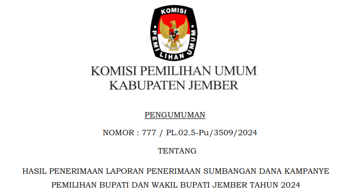 PENGUMUMAN NOMOR : 777/ PL.02.5-Pu/3509/2024 TENTANG HASIL PENERIMAAN LAPORAN PENERIMAAN SUMBANGAN DANA KAMPANYE PEMILIHAN BUPATI DAN WAKIL BUPATI JEMBER TAHUN 2024 , selengkapnya klik di sini