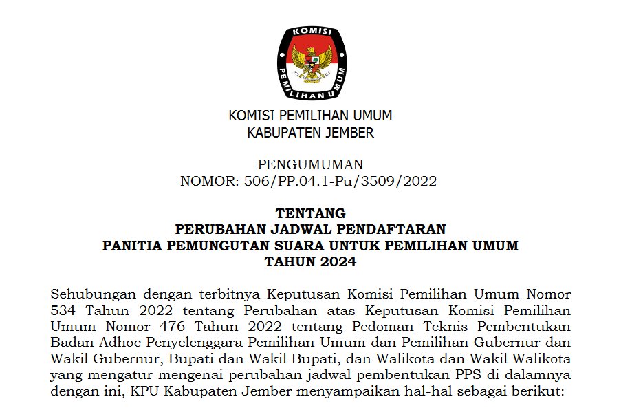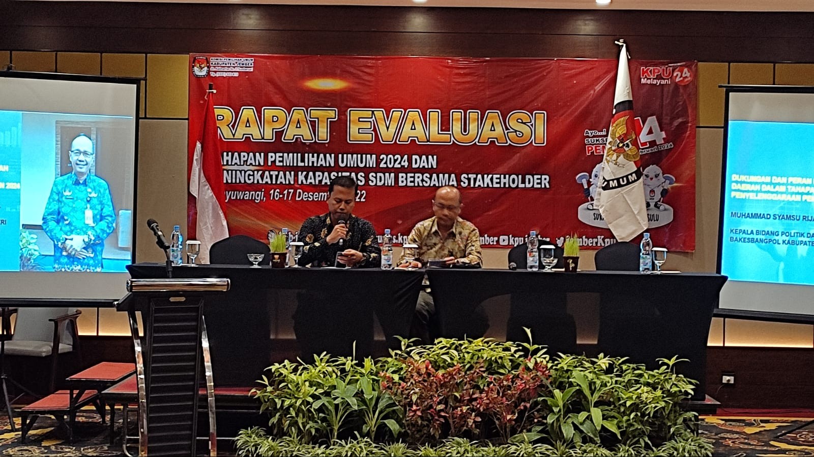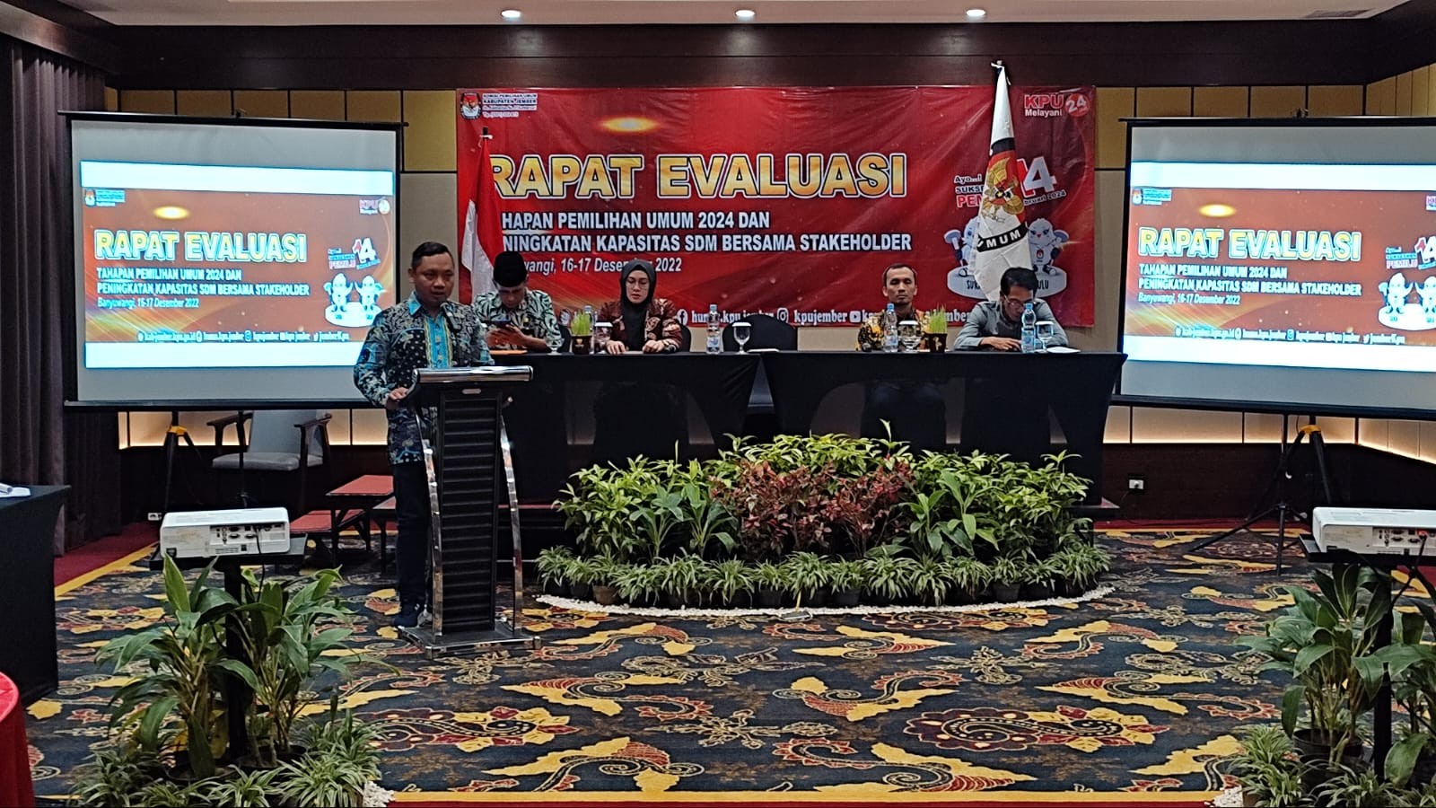KPU Jember- Proses pemilu atau tahapan pemilu 2024 per 14 Desember 2022 sudah mencapai titik penjaringan PPK. Pada tanggal 16 Desember KPU Kabupaten Jember mengadakan evaluasi bersama stakeholder Jember yakni, Bersama Kapolres Jember, Bawaslu Kabupaten Jember, Bakesbangpol, dan Persatuan Wartawan Indonesia. Kegiatan ini dilaksanakan di Banyuwangi tepatnya di Hall Hotel El-Royale Banyuwangi.