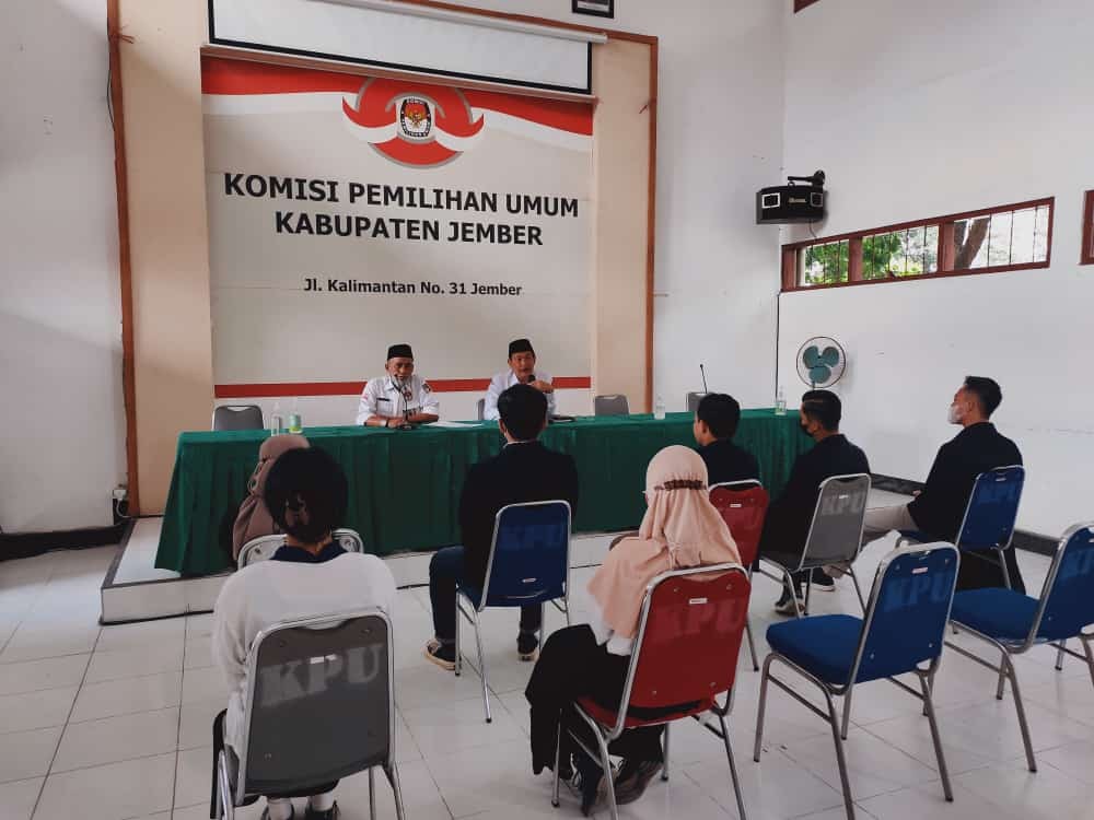 JEMBER – KPU Jember menjadi salah satu instansi yang menerima kegiatan Program Merdeka Belajar Kampur Merdeka (MBKM). Pada Senin (22/8/2022) pihak KPU Jember telah Menerima Mahasiswa Magang dari Kampus Uneversitas Jember diantaranya mahasiswa Fakultas Hukum dan Mahasiswa Fakultas Ilmu Budaya yang akan dilakukan salama empat bulan mulai tanggal 22 Agustus 2022 s.d. 15 Januari 2023. Tamin Hariyanto dan Hadi Susilo, selaku penanggung jawab memberikan arahan tentang tugas dan funsi setiap divisi di lingkungan KPU Jember dengan menerangkan beberapa poin seperti susunan anggota, jam kerja, dan tugas masing-masing divisi yang terbagi menjadi menjadi empat bagian: divisi teknis, divisi program data, divisi hukum dan SDM, dan divisi keuangan umum dan logistik. Tamin juga menekankan poin penting untuk para mahasiswa magang selain menjalankan tugas mebantu KPU di setiap Divisi mahasiswa juga ditekankan untuk melakukan tugasnya. “Kami mengharapkan mahasiswa agar menyicil karya ilmiah selagi magang di tempat kami,” tegasnya. Beliau menerangkan laporan pengalaman anak magang sempat terkendala karena terlalu fokus magang.
