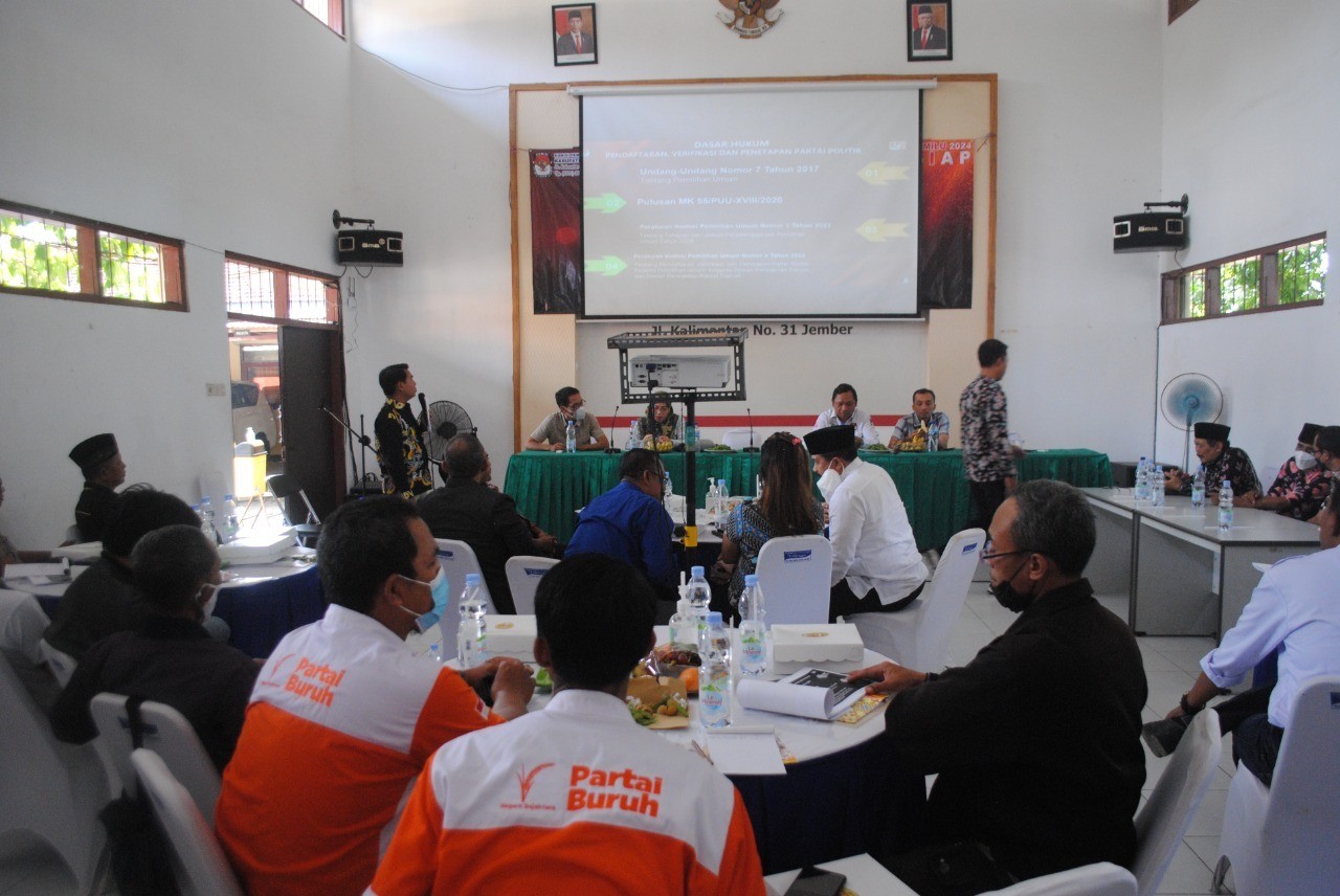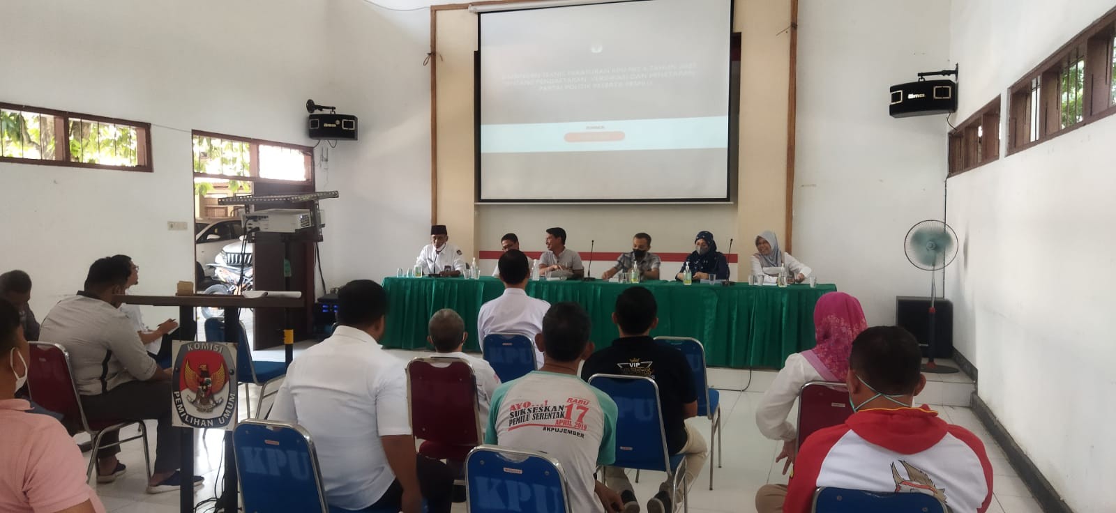 KPU Kabupaten Jember menyelenggarakan kegiatan sosialisasi Peraturan Komisi Pemilihan Umum Nomor 4 Tahun 2022 tentang Pendaftaran, Verifikasi dan Penetapan Partai Politik Peserta Pemilihan Umum Anggota Dewan Perwakilan Rakyat dan Dewan Perwakilan Rakyat Daerah Di aula KPU Jember , Jumat (29/07/22) Kegiatan Sosialisasi dibuka Ketua KPU Kabupaten Jember Muhammad Syai’in, dalam sambutannya menyampaikan bahwa untuk saat ini KPU Kabupaten Jember sudah menerapkan integritas 24 jam serta menjelaskan gambaran umum terkait tahapan pemilu serentak 2024. Untuk sosialisasi Peraturan Komisi Pemilihan Umum Nomor 4 Tahun 2022 diberikan oleh Anggota KPU Kabupaten Jember Achmad Susanto. Dalam kesempatan tersebut, Achmad Susanto memaparkan Peraturan Komisi Pemilihan Umum Nomor 4 Tahun 2022 tentang Pendaftaran, Verifikasi dan Penetapan Partai Politik Peserta Pemilihan Umum Anggota Dewan Perwakilan Rakyat dan Dewan Perwakilan Rakyat Daerah, tugas dan wewenang KPU Kabupaten/Kota dalam penyelenggaraan tahapan serta sosialisasi Hadir dalam kegiatan sosialisasi Ketua Bawaslu Kabupaten Jember, Dinas Kependudukan dan Catatan Sipil, Kepala Dinas Pemberdayaan Masyarakat Desa, Kepala Dinas Kominfo dan Badan Kesbangpol, dari media cetak serta Pengurus Partai Politik