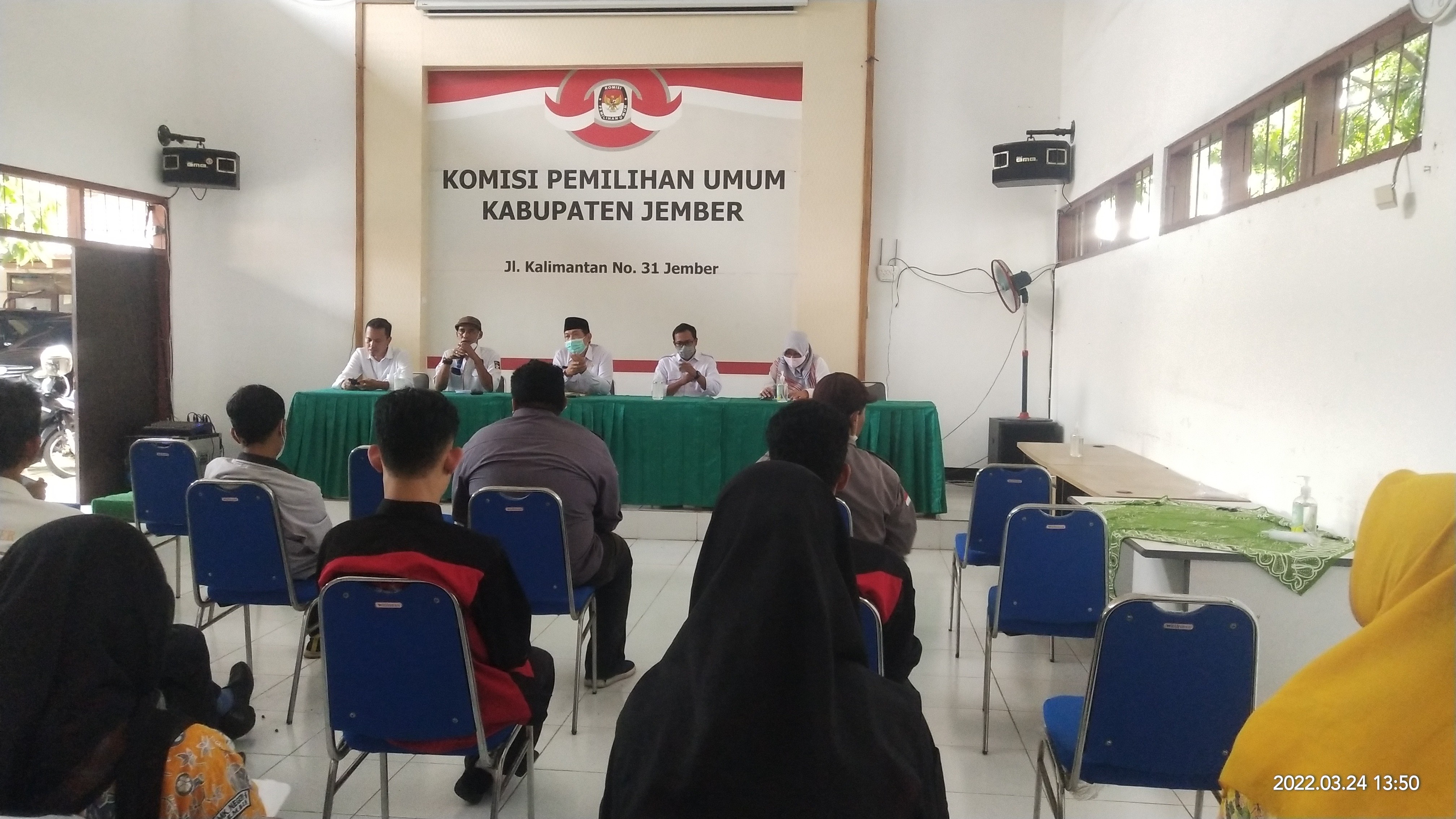 Jember, - Komisi Pemilihan Umum (KPU) Kabupaten Jember melaksanakan Rapat Koordinasi daftar Pemilih Berkelanjutan Triwulan I Tahun 2022 di Media Center KPU, Rabu (30/03/2022). Rapat tersebut dihadiri oleh Bawaslu Kab.Jember,Dispendukcapil Kab. Jember, Kantor Kementrian Agama Kab. Jember dan Kepala dinas kesehatan Kab.Jember. Dalam kesempatan tersebut Komisioner KPU Jember Div. Data dan Informasi Ahmad Hanafi menjelaskan Proses Pemutahiran Data Pemilih untuk semua pemilhan dan pentingnya daftar pemelih dalam sebuah pemilihan "Daftar Pemilih ini sangat penting dalam sebuah pemilih, karena sebagai ujung tombak dari keberhasilan sebuah pemilihan,"katanya Ahmad hanafi menjelaskan juga bahwa daftar pemilih ini dilakukan secara terus menerus oleh KPU Jember yang disebut dengan Daftar Pemilih berkelanjutan "Daftar Pemiih Berkelanjutan ini terus dilakukan secara rutin setiap bulan, dan pada teriwulan di bulanmaret ini daftar pemilih kita sudah 1.840.932 Pemilih,"tambahnya.(tekmas)