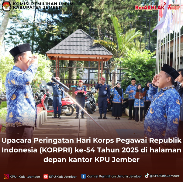 Jember, kab-jember.kpu.go.id – Sekretaris Komisi Pemilihan Umum (KPU) Kabupaten Jember, Agus Zainur Rahmat, memimpin pelaksanaan Upacara Peringatan Hari Korps Pegawai Republik Indonesia (KORPRI) ke-54 Tahun 2025 yang berlangsung di halaman depan Kantor KPU Kabupaten Jember, Senin (1/12/2025). Upacara tersebut diikuti oleh seluruh staf KPU Kabupaten Jember serta mahasiswa magang yang sedang melaksanakan praktik kerja di lingkungan KPU. Para peserta mengikuti rangkaian kegiatan dengan tertib dan penuh khidmat sebagai wujud penghormatan terhadap peran KORPRI dalam mendukung penyelenggaraan pemerintahan dan pelayanan publik. Dalam amanatnya, Agus menekankan pentingnya menjaga jati diri aparatur sipil negara (ASN), khususnya di lingkungan KPU Kabupaten Jember, sebagai bagian dari pemerintah dan pelayan masyarakat. Ia menyampaikan bahwa ASN memiliki tanggung jawab besar dalam menjaga profesionalisme serta memberikan pelayanan yang transparan dan berintegritas. Tema peringatan KORPRI tahun ini, “Bersatu, Berdaulat, Bersama KORPRI dalam Mewujudkan Indonesia Maju”, menurut Agus, menjadi pengingat bahwa ASN harus menjadi kekuatan pemersatu serta mampu menjaga kedaulatan birokrasi dalam menghadapi berbagai tantangan. “ASN harus menjadi bagian penting dalam pembangunan yang berorientasi pada kemajuan bangsa,” ujarnya. Lebih lanjut, ia menegaskan bahwa tantangan birokrasi ke depan semakin kompleks, seiring dengan meningkatnya tuntutan masyarakat dan perkembangan global. Oleh karena itu, ASN KPU Kabupaten Jember diharapkan mampu bertransformasi, bersikap adaptif, serta terus berinovasi dalam menjalankan tugas-tugas pelayanan kepada publik. Peringatan HUT KORPRI ke-54 ini diharapkan dapat memperkuat semangat pengabdian seluruh ASN serta membangun kesadaran akan pentingnya meningkatkan kualitas kinerja dan pelayanan publik, khususnya di lingkungan KPU Kabupaten Jember.