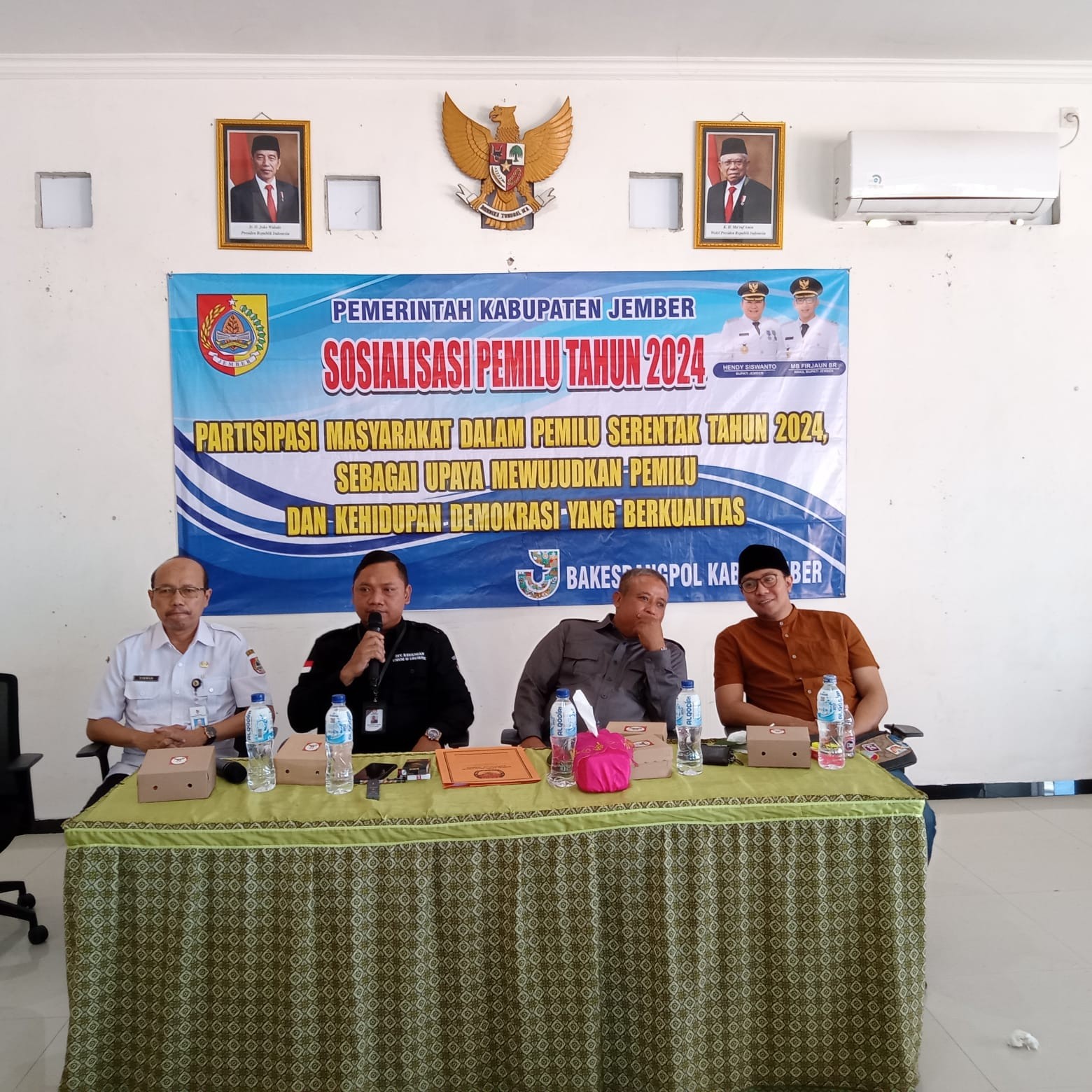 Jember - Badan Kesatuan Bangsa dan Politik, bersama KPU dan Bawaslu Kabupaten Jember menyelenggarakan Sosialisasi Pemilihan Umum 2024 yang diikuti oleh oleh Kepala Desa, Tokoh Masyarakat, Tokoh Agama, Tokoh Pemuda, Unsur Lembaga Kemasyarakatan Desa, PPK dan Panwascam serta perangkat Desa di Wilayah Kecamatan Puger dengan mengambil tema Partisipasi Masyarakat Dalam Pemilu Serentak Tahun 2024, sebagai upaya mewujudkan Pemilu dan Kehidupan Demokrasi yang Berkualitas bertempat di Pendopo Kantor Kecamatan Puger pada hari Rabu tanggal 12 Juli 2023. Dalam sambutannya Camat Puger Drs. Yahya Iskandar menyampaikan selamat datang di pendopo Kantor Kecamatan Puger serta ucapan terima kasih atas pemilihan Kecamatan Puger sebagai tuan rumah kegiatan sosialisasi kali ini. Tak lupa ucapan terima kasih atas kehadiran pada undangan. Kepala Bakesbang dan Politik Dr. Edy Budi Susilo, M.Si dalam sambutannya menyampaikan bahwa tahapan pemilu telah dimulai dan saat ini kurang lebih 7 bulan lagi menuju Pemilu, serta 16 bulan menuju Pemilukada tahun 2024. Pemkab Jember mengambil peran dalam mendukung sukses pelaksanaan pemilu diantaranya penugasan personel ASN/Non ASN pada sekretariat PPK, Panwascam dan PPS, selain itu penyediaan sarana untuk ruangan kerja sekretariat PPK di kantor Kecamatan dan PPS di Kantor Kelurahan/Desa. Selain itu penugasan satuan Linmas di masing-masing TPS juga terkait penyelenggaraan sosialisasi seperti sekarang ini sebagai upaya meningkatkan partisipasi pemilih pada pelaksanaan Pemilu yang akan datang. Menurut Dr. Edy Budi, sosialisasi ini bertujuan agar pesta lima tahunan ini berjalan dengan baik dan efektif dan partisipasi masyarakat tinggi sehingga masyarakat datang ke TPS untuk menyalurkan hak suaranya, serta masyarakat memiliki peningkatan kesadaran bahwa satu suara sangat penting dalam turut menentukan nasib bangsa. Dr. Edy Budi menyebutkan bahwa upaya Pemkab Jember dalam memberikan perhatian salah satunya dengan pembangunan infra struktur berupa akses jalan dengan tujuan memberikan kemudahan bagi distribusi logistik maupun mempermudah masyarakat untuk mendatangi TPS masing-masing dalam turut serta memberikan suaranya dalam Pemilu. Narasumber dalam kegiatan ini diantaranya Bapak Nurhasan (Anggota Komisi A DPRD Kab. Jember) dengan materi berjudul Urgensi Pendidikan Politik Bagi Masyarakat Dalam Sistem Demokrasi. Dalam paparannya anggota Komisi A ini menyampaikan bahwa pendidikan politik merupakan proses pembelajaran dan pemahaman tentang hak, kewajiban dan tanggung jawab setiap warga negara dalam kehidupan berbangsa dan bernegara. Melalui pendidikan politik diharapkan terjadinya perubahan sikap rakyat dari sinisme politik, kepasifan dan apatisme politik bisa beralih menjadi sikap aktif partisipatif, kegairahan berpolitik, berinisiatif, proaktif, inovatif dan demokratif, hal tersebut sangat diperlukan. Sebab setiap warga negara harus ikut membangun masyarakat dan negara, bahkan wajib diberikan kesempatan oleh pemerintah untuk membangun diri sendiri dan membangun masyarakat lingkungannya untuk bisa maju dan berkesejahteraan. Narasumber kedua Bpk. Muhammad Syaiin (Ketua KPU Kab. Jember) yang menyampaikan materi Upaya dan Strategi KPU Kabupaten Jember Dalam Meningkatkan Partisipasi Masyarakat Dalam Pemilu tahun 2024. Dalam paparannya ketua KPU Jember ini menyampaikan beberapa hal diantaranya Pentingnya Meningkatkan Partisipasi Politik Masyarakat, Faktor yang menyebabkan rendahnya partisipasi politik serta upaya untuk meningkatkan partisipasi politik masyarakat, penyebab rendahnya partisipasi serta upaya-upaya yang dilakukan dalam rangka meningkatkan tingkat partisipasi masyarakat. Narasumber berikutnya Narasumber bapak Andika A. Firmansyah, SH (Anggota Bawaslu Kabupaten Jember) yang menyampaikan materi terkait Sumber Daya Manusia Pengawasan serta tugas dan Fungsi Bawaslu. Menurut Andika Bawaslu memiliki fungsi Pengawasan, Pencegahan dan Penindakan dalam pelaksanaan Pemilu. Selain menjelaskan tentang jenis-jenis pelanggaran serta sanksinya Andika juga juga menyampaikan beberapa langkah untuk mengantisipasi kecurangan. Masyarakat jangan ragu untuk melaporkan indikasi kecurangan tentunya laporan harus dilengkapi dengan bukti-bukti yang kuat untuk bisa diproses lebih lanjut. Pemilu menjadi salah satu penanda kualitas Demokrasi di Indonesia. Anggota Bawaslu ini memiliki tagline Bersama Rakyat Awasi Pemilu, Bersama Bawaslu Tegakkan Keadilan Pemilu.