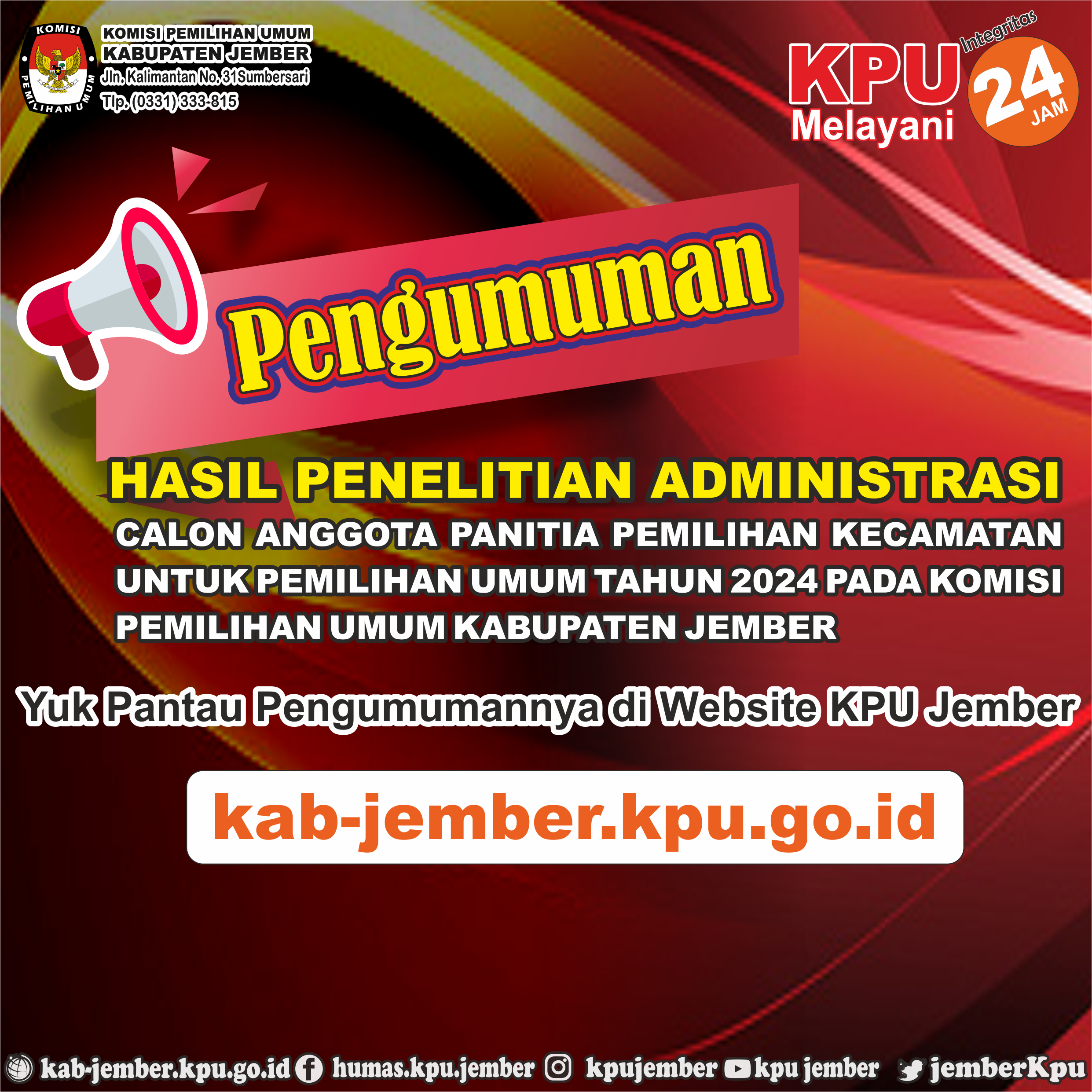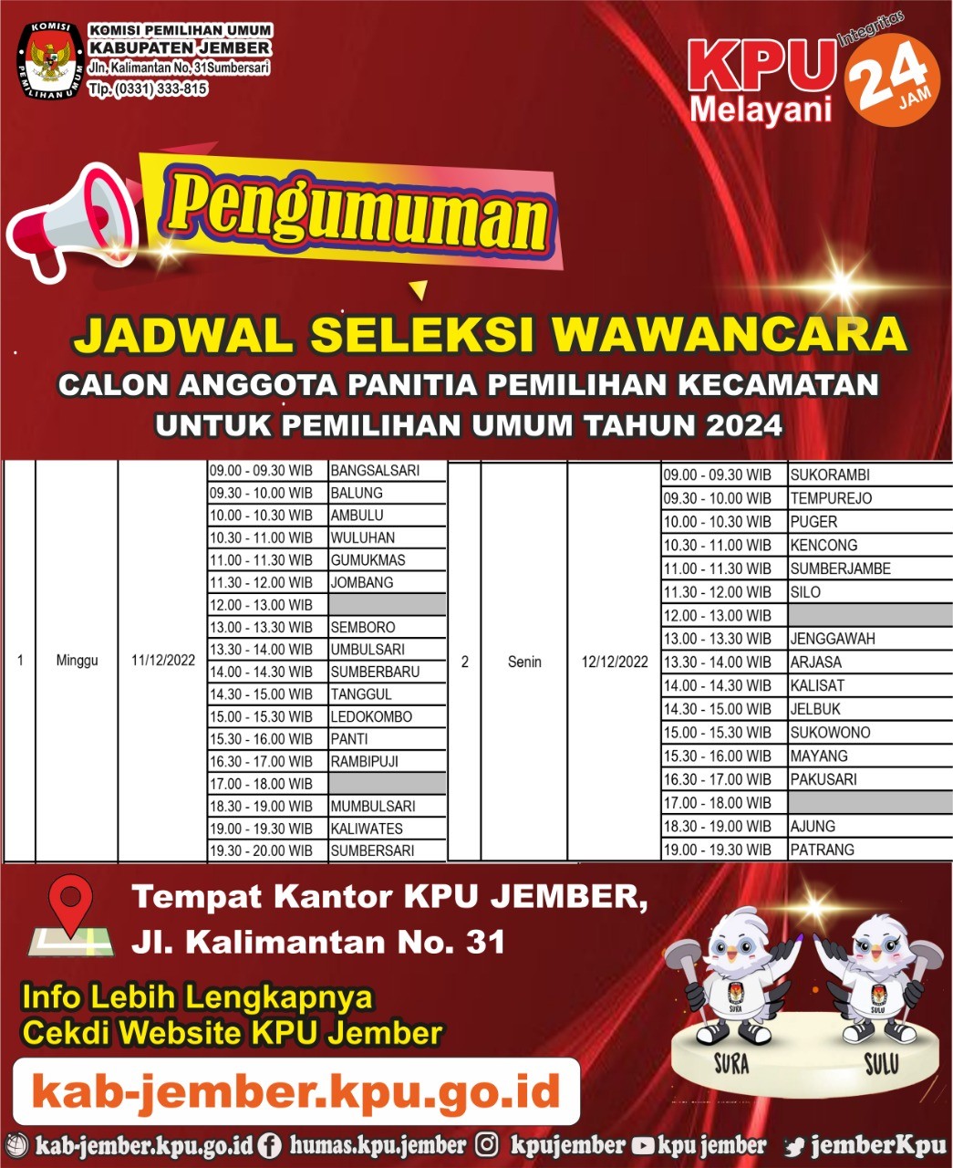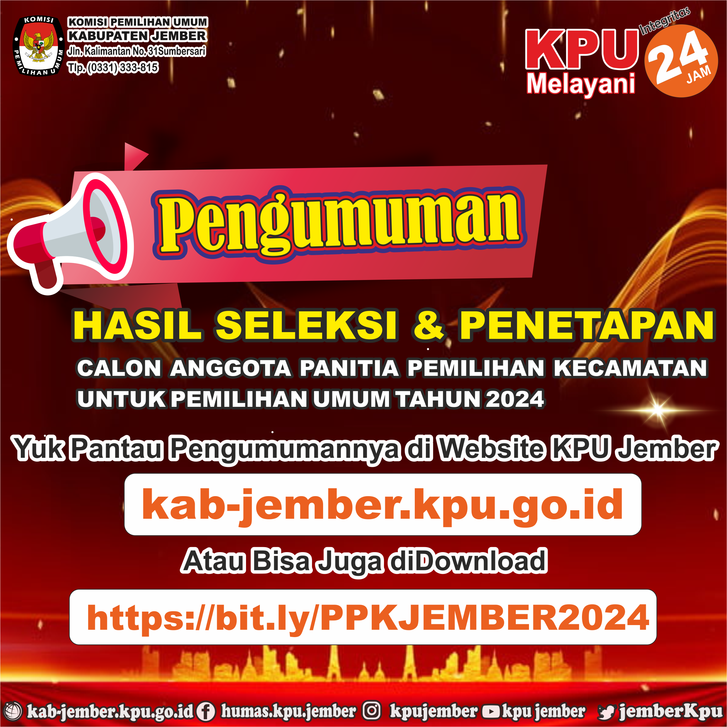 Berdasarkan Berita Acara Rapat Pleno Komisi Pemilihan Umum Kabupaten Jember Nomor 85/PK.01-BA/3509/2022 tanggal 13 Desember 2022 tentang Hasil Wawancara Calon Anggota Panitia Pemilihan Kecamatan pada Pemilihan Umum Tahun 2024, disampaikan hal-hal sebagai berikut: 1. KPU Kabupaten Jember telah melaksanakan tahapan pembentukan Panitia Pemilihan Kecamatan untuk Pemilu tahun 2024 pada tanggal 2 November 2022 sampai dengan 12 Desember 2022; 2. KPU Kabupaten Jember menetapkan calon anggota Panitia Pemilihan Kecamatan peringkat 1 s/d 5 ditetapkan sebagai calon Anggota Panitia Pemilihan Kecamatan yang terpilih dan calon anggota Panitia Pemilihan Kecamatan peringkat 6 s/d 10 sebagai calon Pengganti Antar waktu anggota Panitia Pemilihan Kecamatan sebagaimana daftar terlampir; 3. Sehubungan dengan hal tersebut di atas, KPU Kabupaten Jember mengundang calon anggota Panitia Pemilihan Kecamatan terpilih untuk hadir dalam pelantikan, pengambilan sumpah/janji, dan penand tanganan fakta integritas anggota Panitia Pemilihan Kecamatan pada : Hari, Tanggal : Rabu, 4 Januari 2023 Pakaian :atasan kemeja putih dan bawahan celana panjang/rok hitam dan bersepatu. : waktu dan tempat akan diinformasikan kemudian d Website KPU Kabupaten Jember. Catatan 4. Calon anggota Panitia Pemilihan Kecamatan terpilih dapat melakukan konfirmasi kepada KPU Kabupaten Jember melalui : Alamat E-Mail : Jl. Kalimantan No. 31 Jember : helpdesk.kpujember@gmail.com Demikian pengumuman ini disampaikan untuk diketahui. PENGUMUMAN KLIKDISINI