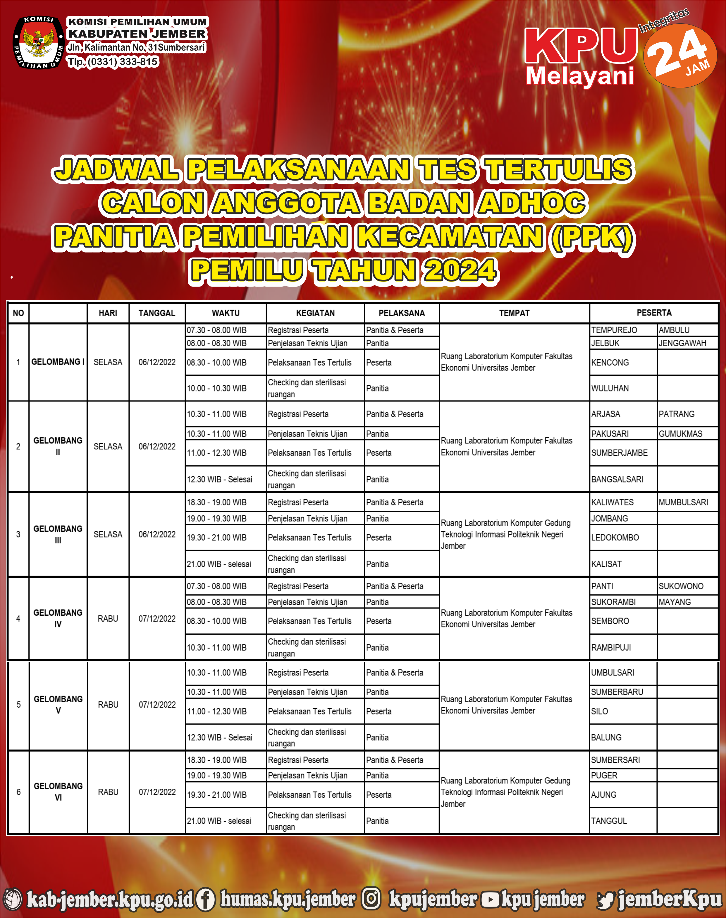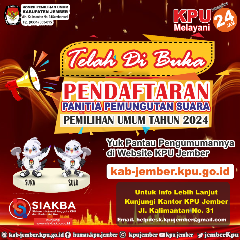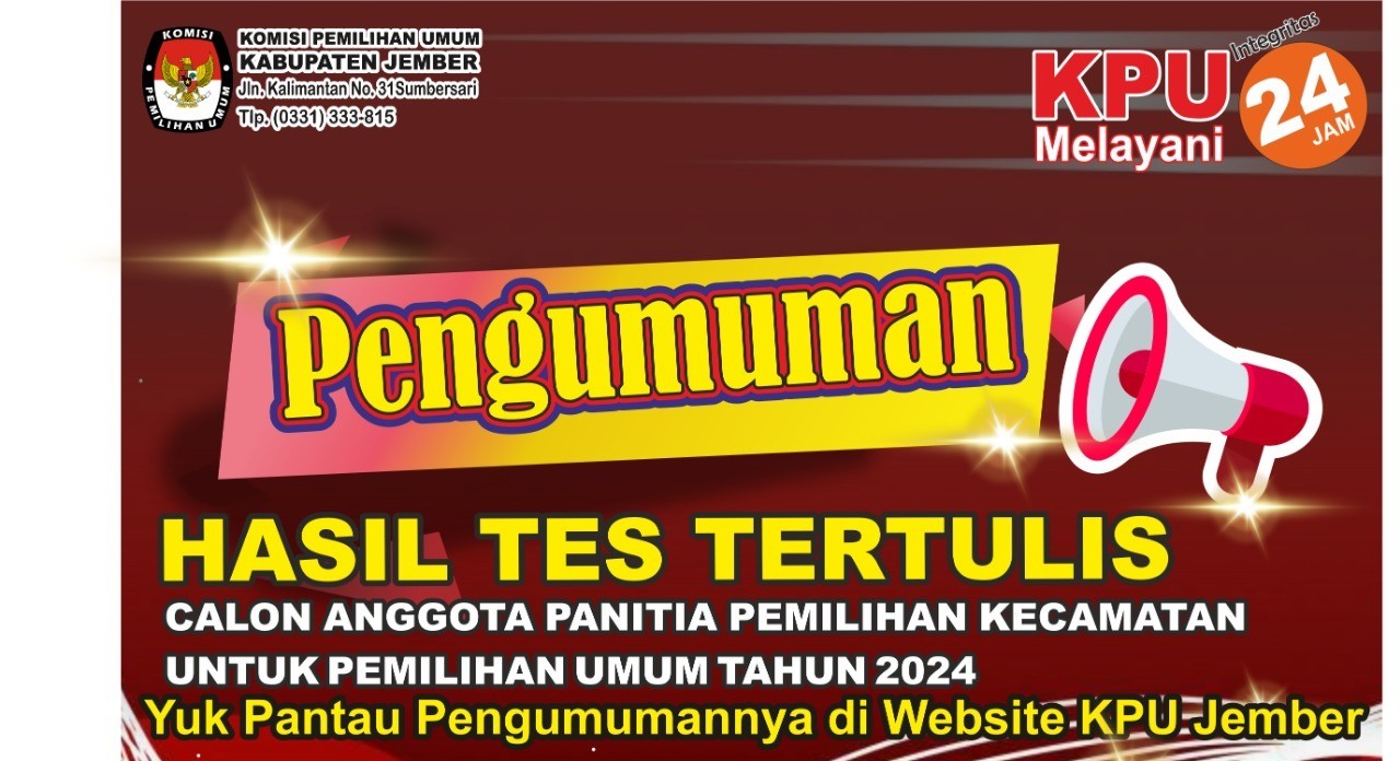 Berdasarkan Berita Acara Rapat Pleno Komisi Pemilihan Umum Kabupaten Jember Nomor 85/PK.01-BA/3509/2022 tanggal 13 Desember 2022 tentang Hasil Wawancara Calon Anggota Panitia Pemilihan Kecamatan pada Pemilihan Umum Tahun 2024, disampaikan hal-hal sebagai berikut: 1. KPU Kabupaten Jember telah melaksanakan tahapan pembentukan Panitia Pemilihan Kecamatan untuk Pemilu tahun 2024 pada tanggal 2 November 2022 sampai dengan 12 Desember 2022; 2. KPU Kabupaten Jember menetapkan calon anggota Panitia Pemilihan Kecamatan peringkat 1 s/d 5 ditetapkan sebagai calon Anggota Panitia Pemilihan Kecamatan yang terpilih dan calon anggota Panitia Pemilihan Kecamatan peringkat 6 s/d 10 sebagai calon Pengganti Antar waktu anggota Panitia Pemilihan Kecamatan sebagaimana daftar terlampir; 3. Sehubungan dengan hal tersebut di atas, KPU Kabupaten Jember mengundang calon anggota Panitia Pemilihan Kecamatan terpilih untuk hadir dalam pelantikan, pengambilan sumpah/janji, dan penand tanganan fakta integritas anggota Panitia Pemilihan Kecamatan pada : Hari, Tanggal : Rabu, 4 Januari 2023 Pakaian :atasan kemeja putih dan bawahan celana panjang/rok hitam dan bersepatu. : waktu dan tempat akan diinformasikan kemudian d Website KPU Kabupaten Jember. Catatan 4. Calon anggota Panitia Pemilihan Kecamatan terpilih dapat melakukan konfirmasi kepada KPU Kabupaten Jember melalui : Alamat E-Mail : Jl. Kalimantan No. 31 Jember : helpdesk.kpujember@gmail.com Demikian pengumuman ini disampaikan untuk diketahui. PENGUMUMAN KLIKDISINI