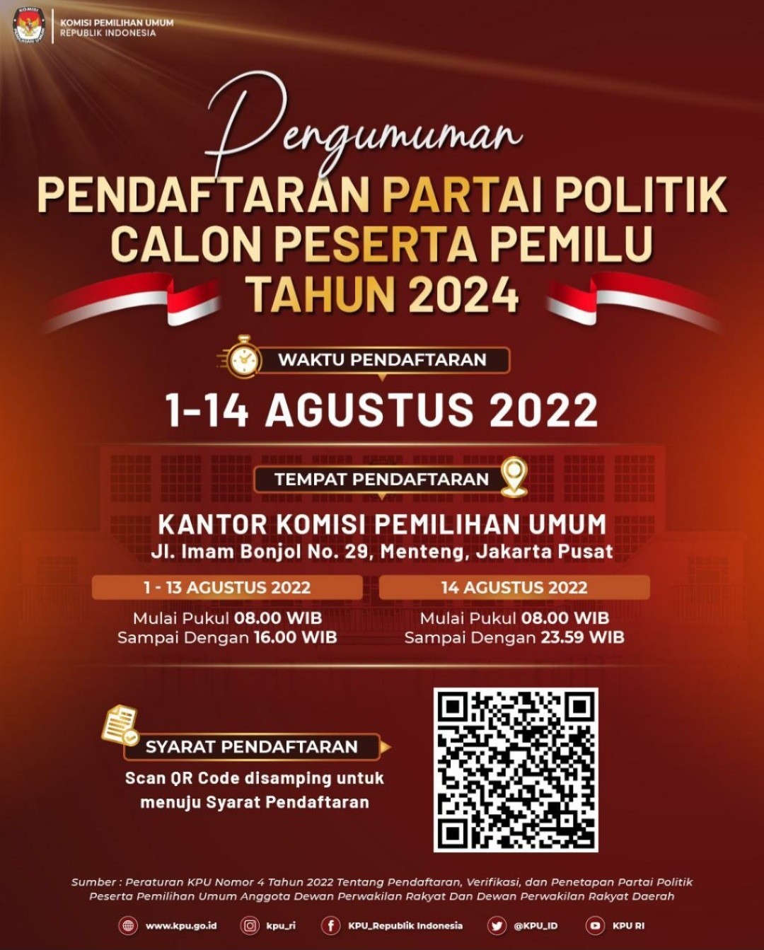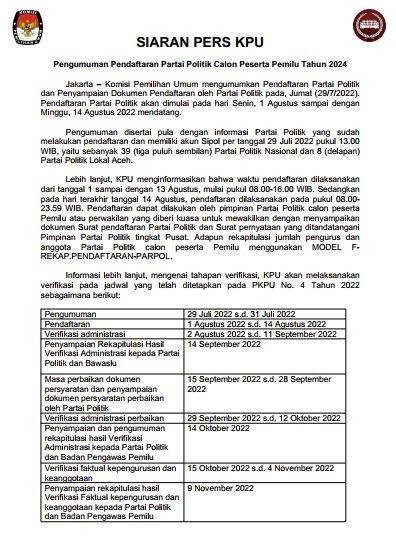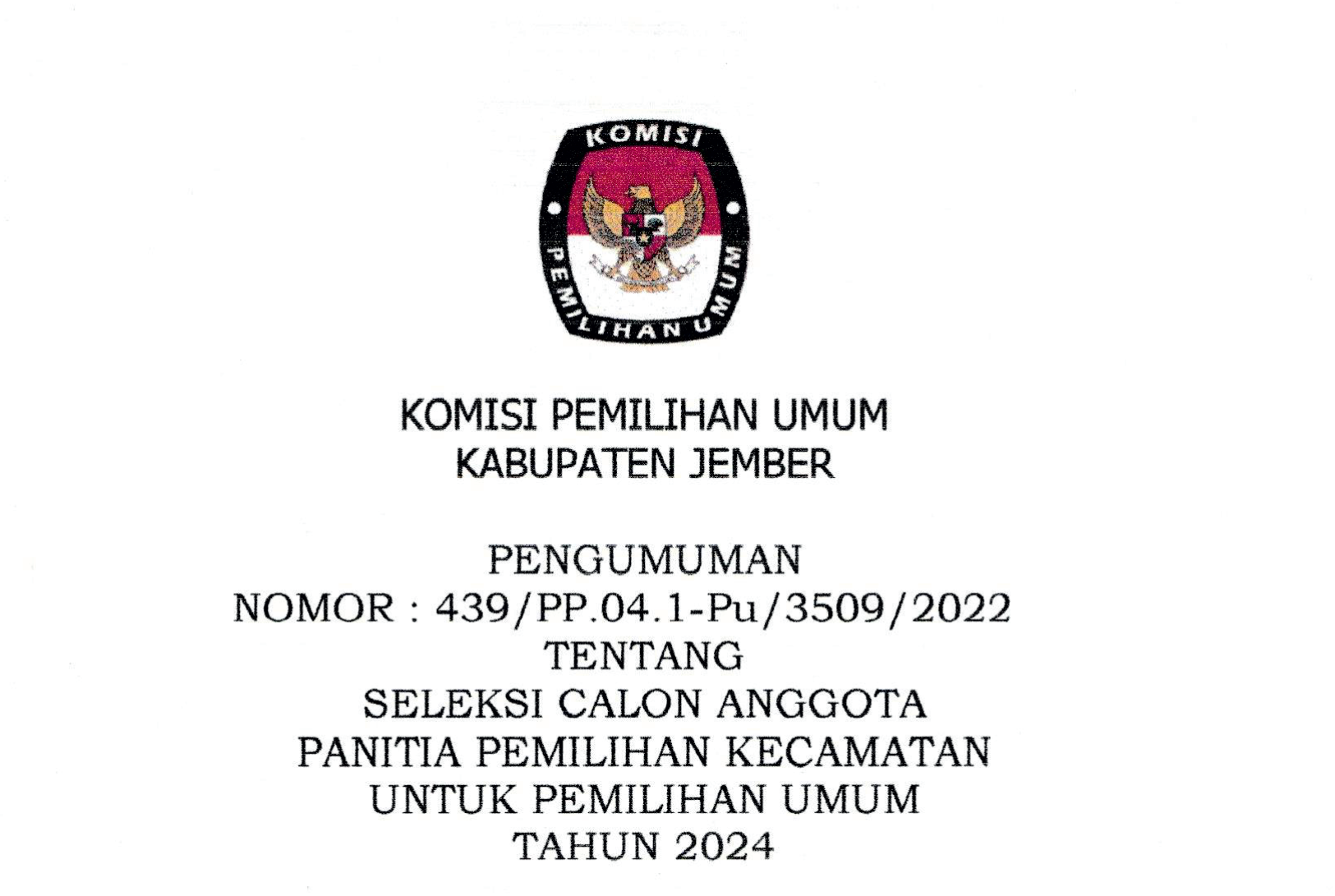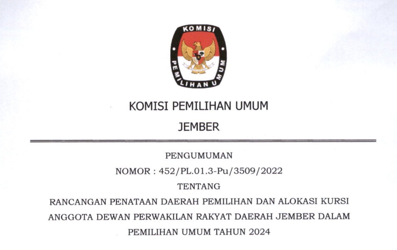 Dalam rangka pembentukan Panitia Pemilihan Kecamatan untuk Pemilihan Umum Tahun 2024, Komisi Pemilihan Umum Kabupaten Jember mengundang Warga Negara Indonesia yang memenuhi persyaratan untuk mendaftarkan diri menjadi anggota Panitia Pemilihan Kecamatan untuk Pemilihan Umum dengan ketentuan sebagai berikut: Persyaratan Anggota PPK Warga Negara Indonesia; berusia paling rendah 17 (tujuh belas) tahun; setia kepada Pancasila sebagai dasar Negara, Undang-Undang Dasar Negara Republik Indonesia Tahun 1945, Negara Kesatuan Republik Indonesia, Bhinneka Tunggal Ika, dan cita-cita Proklamasi 17 Agustus 1945; mempunyai integritas, pribadi yang kuat, jujur dan adil; tidak menjadi anggota Partai Politik yang dinyatakan dengan surat pernyataan yang sah, atau sekurang-kurangnya 5 (lima) tahun tidak lagi menjadi anggota partai politik yang dibuktikan dengan surat keterangan dari pengurus partai politik yang bersangkutan; berdomisili dalam wilayah kerja PPK/PPS*); mampu secara jasmani, rohani, dan bebas dari penyalahgunaan narkotika; berpendidikan paling rendah sekolah menengah atas atau sederajat; dan tidak pernah dipidana penjara berdasarkan putusan pengadilan yang telah memeroleh kekuatan hukum tetap karena melakukan tindak pidana yang diancam dengan pidana penjara 5 (lima) tahun atau lebih. Kelengkapan Dokumen Persyaratan: Surat pendaftaran sebagai calon anggota PPK Fotokopi Kartu Tanda Penduduk Elektronik; Fotokopi ijazah sekolah menengah atas/sederajat atau ijazah terakhir; Surat pernyataan dalam satu dokumen yang menyatakan : setia kepada Pancasila sebagai dasar Negara, Undang-Undang Dasar Negara Republik Indonesia Tahun 1945, Negara Kesatuan Republik Indonesia, Bhinneka Tunggal Ika, dan cita-cita Proklamasi 17 Agustus 1945; tidak menjadi anggota Partai Politik; bebas dari penyalahgunaan narkotika; tidak pernah dipidana penjara berdasarkan putusan pengadilan yang telah memeroleh kekuatan hukum tetap karena melakukan tindak pidana yang diancam dengan pidana penjara 5 (lima) tahun atau lebih; tidak pernah dijatuhi sanksi pemberhentian tetap oleh KPU Kabupaten/Kota atau Dewan Kehormatan Penyelenggara Pemilu; tidak menjadi tim kampanye atau tim pemenangan atau saksi peserta Pemilu atau Pemilihan pada penyelenggaraan Pemilu dan Pemilihan paling singkat dalam 5 (lima) tahun terakhir; tidak berada dalam ikatan perkawinan dengan sesama penyelenggara Pemilu; tidak memiliki penyakit penyerta (komorbiditas); mempunyai kemampuan dan kecakapan dalam membaca, menulis dan berhitung; dan mampu mengoperasikan perangkat teknologi informasi. Surat keterangan dari partai politik yang bersangkutan bagi calon yang paling singkat 5 (lima) tahun tidak lagi menjadi anggota Partai Politik; Surat keterangan sehat jasmani dan rohani yang dikeluarkan oleh puskesmas, rumah sakit, atau klinik yang termasuk di dalamnya terdapat pemeriksaan tekanan darah, kadar gula darah, dan kolesterol; Daftar Riwayat Hidup; Pas Foto Berwarna 4x6; dan Surat Pendaftaran dan kelengkapan dokumen disampaikan kepada KPU Kabupaten Jember sejak tanggal 20 November 2022 sampai dengan tanggal 29 November 2022 Pukul 16.00 WIB siakba.kpu.go.id dan dokumen fisik yang disampaikan pada saat sebelum pelaksanaan seleksi tertulis; atau Petugas Pendaftaran di Kantor Sekretariat KPU Kabupaten Jember PENGUMUMAN KLIK DISINI
