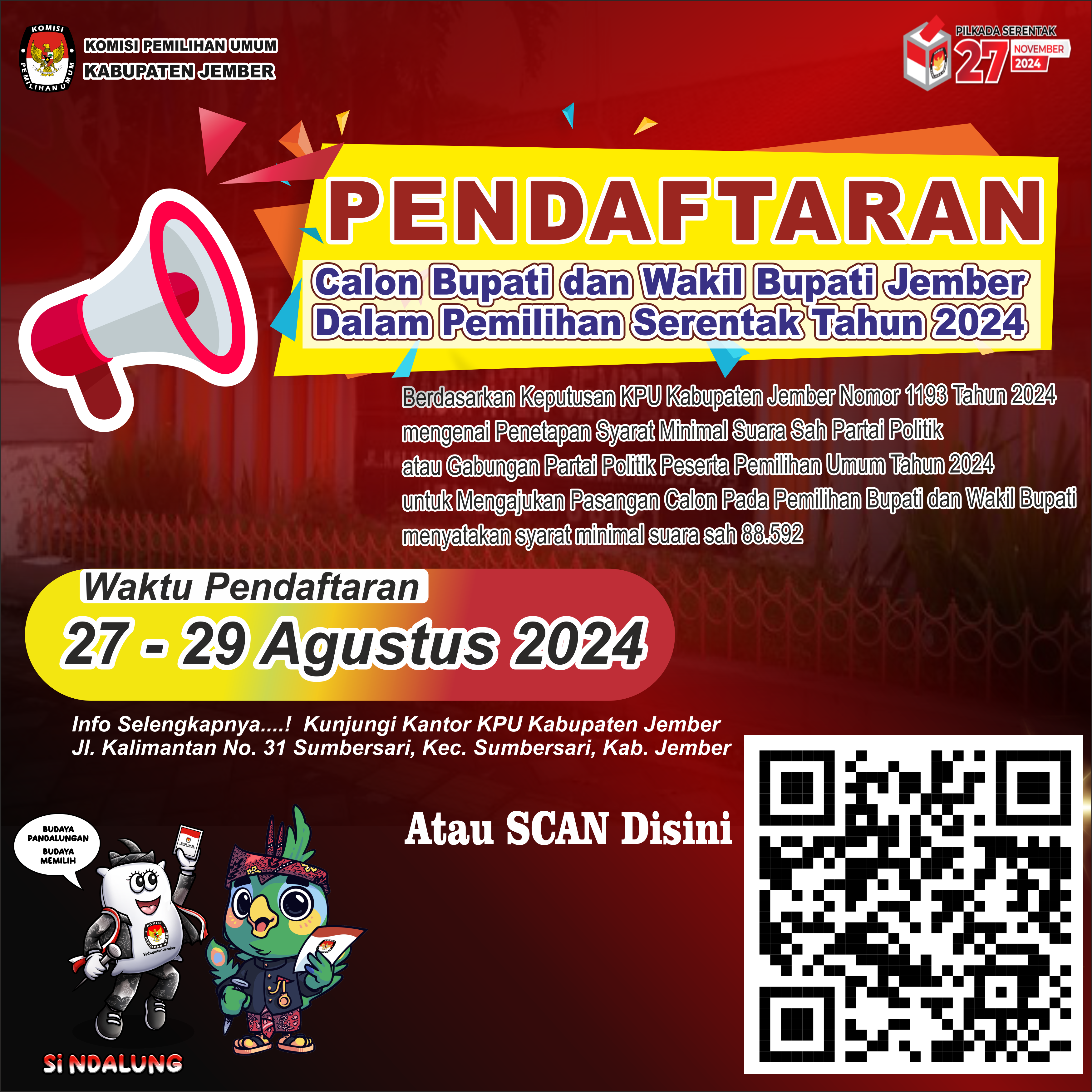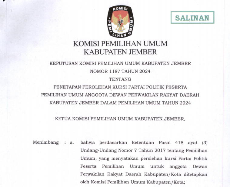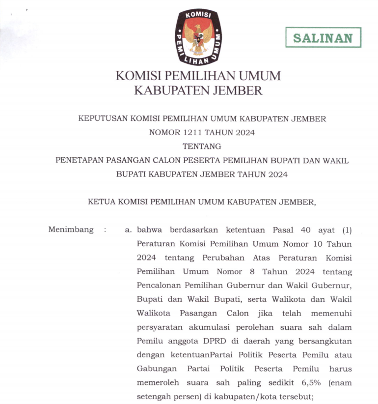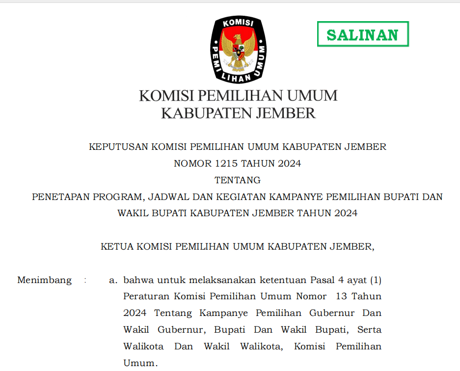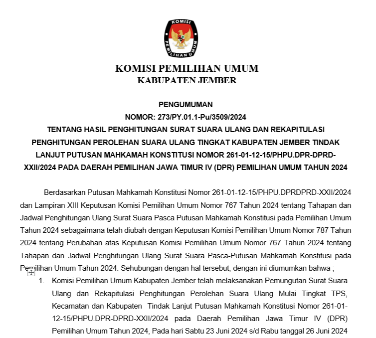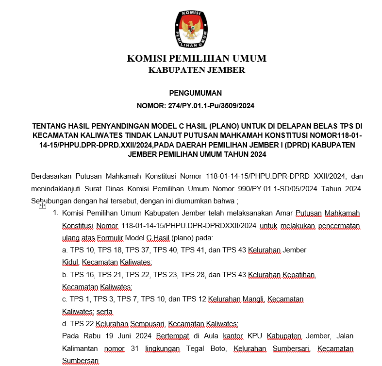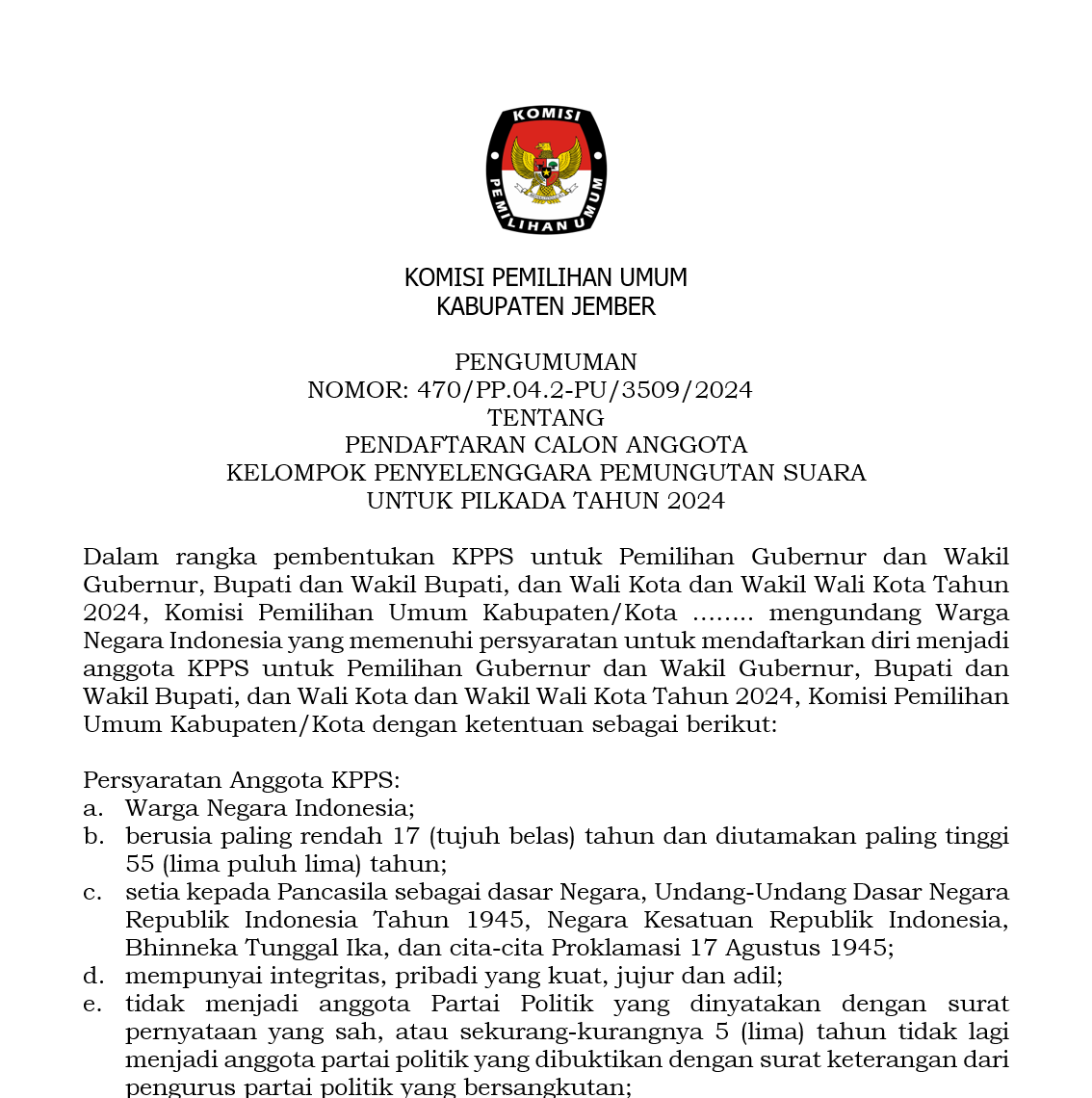 Dalam rangka pembentukan KPPS untuk Pemilihan Gubernur dan Wakil Gubernur Provinsi Jawa Timur, serta Bupati dan Wakil Bupati Kabupaten Jember, Tahun 2024, Komisi Pemilihan Umum Kabupaten Jember mengundang Warga Negara Indonesia yang memenuhi persyaratan untuk mendaftarkan diri menjadi anggota KPPS untuk Pemilihan Gubernur dan Wakil Gubernur Provinsi Jawa Timur, serta Bupati dan Wakil Bupati, Kabupaten Jember Tahun 2024 Link Pengumuman : Klik disini,