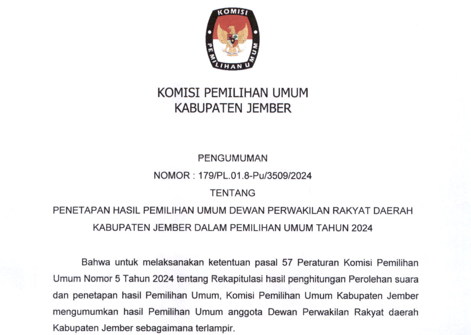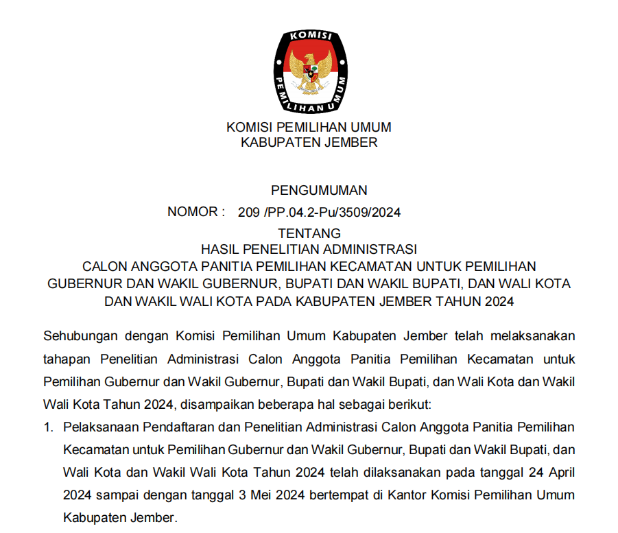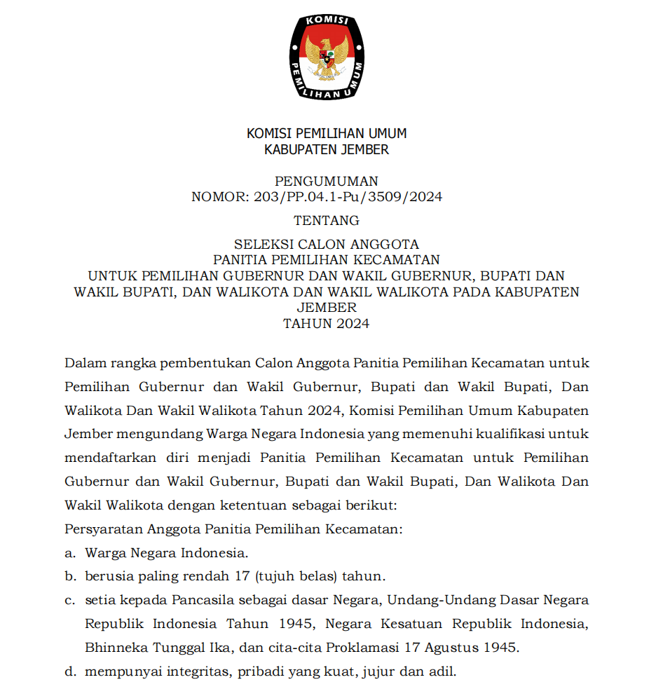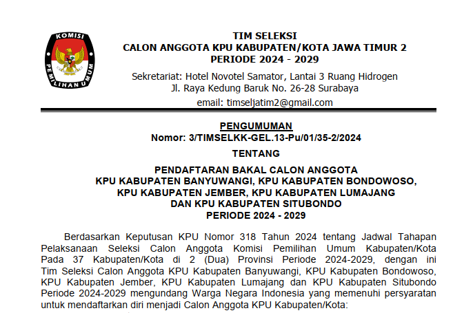 Berikut disampaikan Pengumuman Tentang Pendaftaran Bakal Calon Anggota KPU Kabupaten/Kota pada 36 Kabupaten/Kota di Jawa Timur Periode 2024-2029